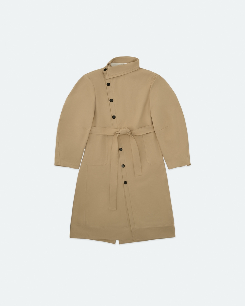 Thiết kế bất đối xứngCổ áo và hàng khuy lệchTúi đắp phía trước Tay áo dáng congDây thắt ở eo