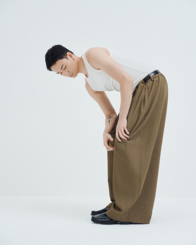 Phom quần ống rộng được biến tấu với chi tiết may đo, mang đến vẻ thanh lịch thoải mái.